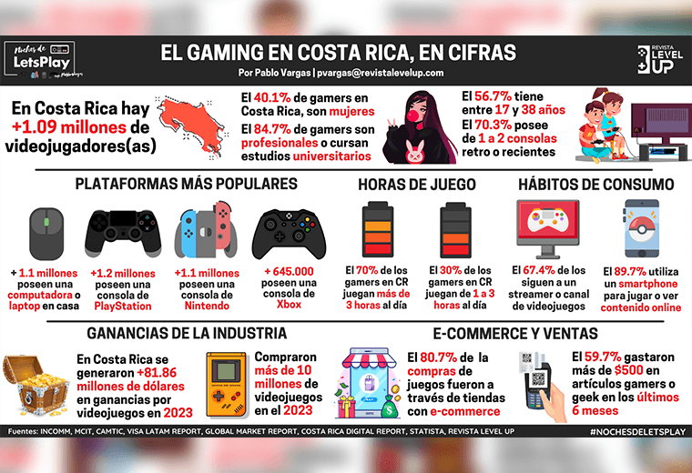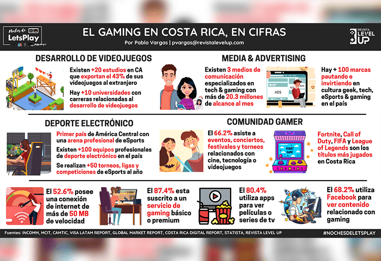 Todas estas, señales de una industria de videojuegos en Costa Rica, en el que el 89.7% de los gamers apuesta por servicios y dispositivos de entretenimiento electrónico para consumir contenido multimedia, existiendo tres medios de comunicación especializados en cultura geek, tech & gaming —con más de 10 años de trayectoria—, como el caso de Revista Level Up, con presencia en medios de comunicación tradicionales y que registra más de 10.3 millones de personas alcanzadas al mes.