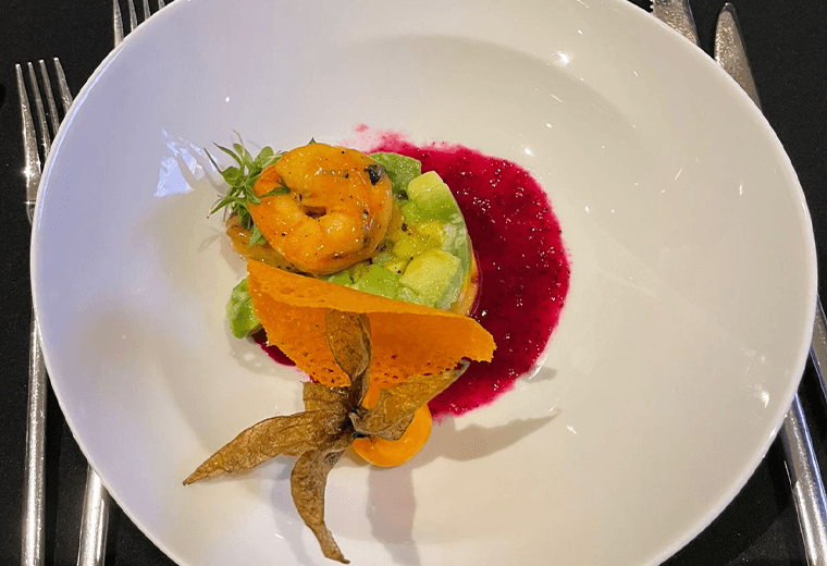 Tartar de camarón: con coulis de pitaya y un timbal de manga madura con tajín, aguacate y camarones marinados con maracuyá. Un plato refrescante y lleno de sabor.