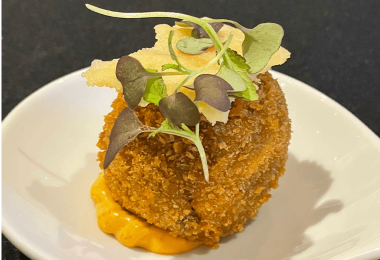 Arancini de hongo: croquetas de hongo acompañadas de alioli con pimentón ahumado y un crocante de queso parmesano.